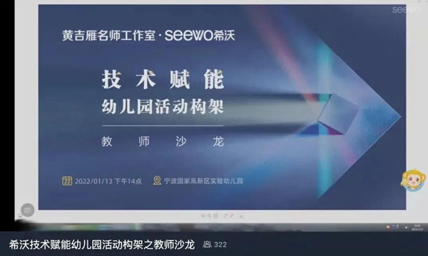 1月14日下午,由寧波國(guó)家高新區(qū)教育教學(xué)研究室、黃吉雁名師工作室主辦,希沃協(xié)辦的“技術(shù)賦能幼兒園活動(dòng)架構(gòu)的教師沙龍”在寧波國(guó)家高新區(qū)實(shí)驗(yàn)幼兒園順利舉行,來(lái)自寧波市高新區(qū)8所幼兒園的15位教師參加了本次沙龍。與此同時(shí),因?yàn)橐咔樵缫逊偶俚膶幭墓淘新〉驴h和原州區(qū)的300余位幼兒園老師們也通過(guò)云端在線觀摩了本次活動(dòng),并通過(guò)留言、二維碼答題等方式,和現(xiàn)場(chǎng)的老師們進(jìn)行了互動(dòng)。