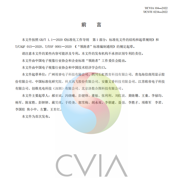 2022年11月22日,由中國電子視像行業協會牽頭,廣州視睿電子作為第一起草單位,聯合國內多家單位和企業共同起草完成的《質量分級及“領跑者”評價要求