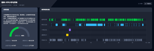 希沃課堂智能反饋系統(tǒng),可以將課堂進(jìn)行結(jié)構(gòu)化分析,對(duì)課堂互動(dòng)環(huán)節(jié)進(jìn)行標(biāo)識(shí),同時(shí)通過語音轉(zhuǎn)文本的方式,讓老師可以快速定位到關(guān)注的模塊,對(duì)課堂互動(dòng)、提問設(shè)計(jì)進(jìn)行回顧,查看教學(xué)設(shè)計(jì)和教學(xué)實(shí)施間的差異,明確后續(xù)改善方向。