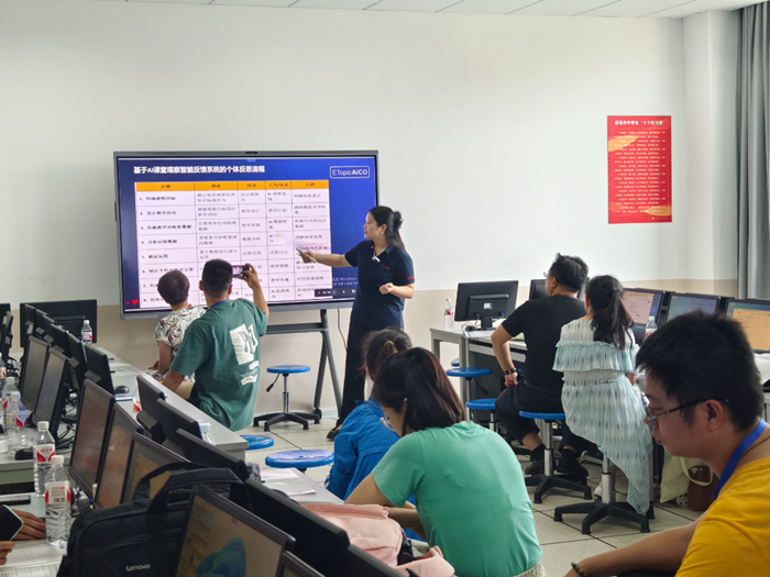 ETopic湘機中學工作站站長曹圓龑與參訓教師深度分享了如何開展AiCO主題校本研修和社群建設。她介紹,以“人工智能課堂觀察”為主題設計、實踐協作性活動,能夠幫助探索促使學生學習改善、教師個人成長、教研團隊發展、學校教育提升的可行路徑。湘潭教育學院(湘潭市中小學教師發展中心)教師毛方吉介紹了AI如何從區域層面規劃區域骨干教師建設,并通過“以師育師”的方式進行區域教師的數字素養整體提升。