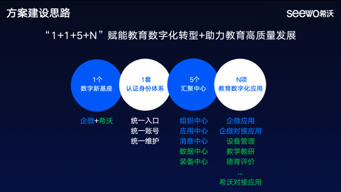 此次合作,希沃魔方與企業(yè)微信基于希沃魔方·數(shù)字基座的全景架構(gòu),結(jié)合希沃在硬件終端、教育應(yīng)用及數(shù)據(jù)平臺的建設(shè)基礎(chǔ),以及希沃魔方和企業(yè)微信優(yōu)秀的第三方開放能力,總結(jié)出“1+1+5+N”的數(shù)字基座構(gòu)建思路。即對端口、身份及組織架構(gòu)進(jìn)行統(tǒng)一,構(gòu)建完整的應(yīng)用中心整合體系,為用戶提供教育全場景應(yīng)用,實現(xiàn)了數(shù)字基座的整體構(gòu)建,助力推動數(shù)字技術(shù)全面賦能教育生態(tài)系統(tǒng)的進(jìn)程。