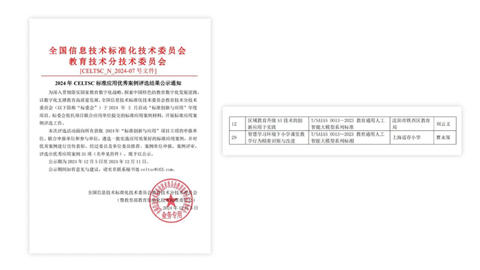 近日,全國信息技術(shù)標(biāo)準(zhǔn)化技術(shù)委員會(huì)教育技術(shù)分技術(shù)委員會(huì)暨教育部教育信息化技術(shù)標(biāo)準(zhǔn)委員會(huì)(以下簡稱“標(biāo)委會(huì)”)于海南省三亞市召開了“2024下半年全體會(huì)議暨教育信息化技術(shù)標(biāo)準(zhǔn)研討會(huì)”,公布了2024年CELTSC標(biāo)準(zhǔn)應(yīng)用優(yōu)秀案例評(píng)選結(jié)果。由廣州視睿電子科技有限公司(希沃)技術(shù)支持的兩個(gè)案例入選,分別是沈陽市鐵西區(qū)教育局的《區(qū)域教育升級(jí)AI技術(shù)的創(chuàng)新應(yīng)用于實(shí)踐》、上海市長寧區(qū)適存小學(xué)的《智慧學(xué)習(xí)環(huán)境下小學(xué)課堂教學(xué)行為精準(zhǔn)識(shí)別與改進(jìn)》。