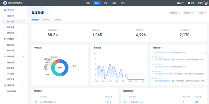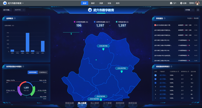 智能監測下的資源優化新格局:全市近1400臺班班通設備已無縫接入武穴市數字教育平臺,由此開啟了設備管理的智能時代。平臺宛如學校設備的 “中樞神經系統”,對全市學校設備數據進行實時監測,每一臺設備的運行狀況、使用頻率等信息都能精準反饋。