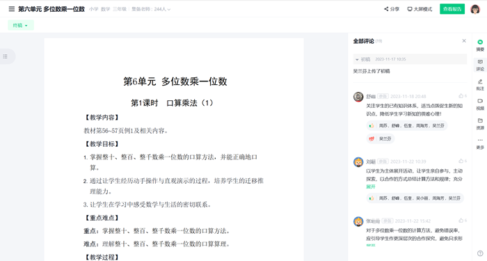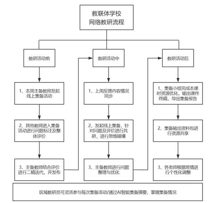 各教聯體學校本著“共建、共贏、共享”的原則,充分應用在線教研工具,打造常態化線上線下相融合的集體備課與聽課評課模式,并通過優化教研活動流程、提升異地同步教研效率,更好實現教學相長,進一步提升教聯體各校區教學水平和教育質量。通過本學期的應用,也初步沉淀出了網絡集體備課的開展范式: