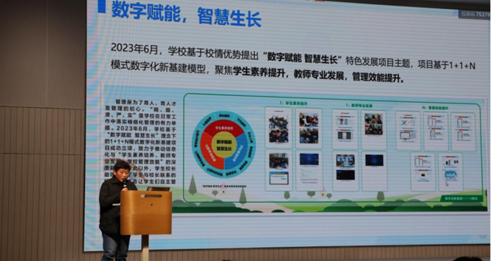 2023年6月,學校提出了數字賦能智慧生長的特色發展項目。旨在充分利用兩個平臺的優勢互補,結合校情進行整合,使希沃魔方和釘釘平臺在學校教育教學與管理中發揮更大的作用。主題項目主要基于加1+1+N模式的數字化新基建,分別是學生素養提升、教師專業發展和學校的管理效能提升三個維度。