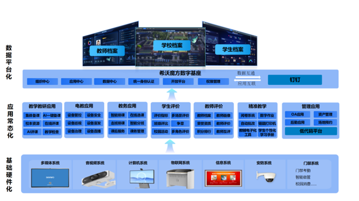 學校從數據的平臺化、應用常態化、基礎硬件化這三個層級有序來推進學校的數字化發展。并依托希沃和釘釘專業的技術能力,整合學校的現有的應用和數據的互通,搭建教研平臺、設備管理平臺、學生綜合素質評價平臺,協同釘釘家校管理平臺構建一個高效、便捷、智能的數字化教育教學與管理環境,推動學校整體運營水平的提升。學校經過不斷的實踐和評估,總結經驗教訓,將數字化轉型推向常態化,最終構建幸福教育,為學生和教師的成長提供有力支持。
