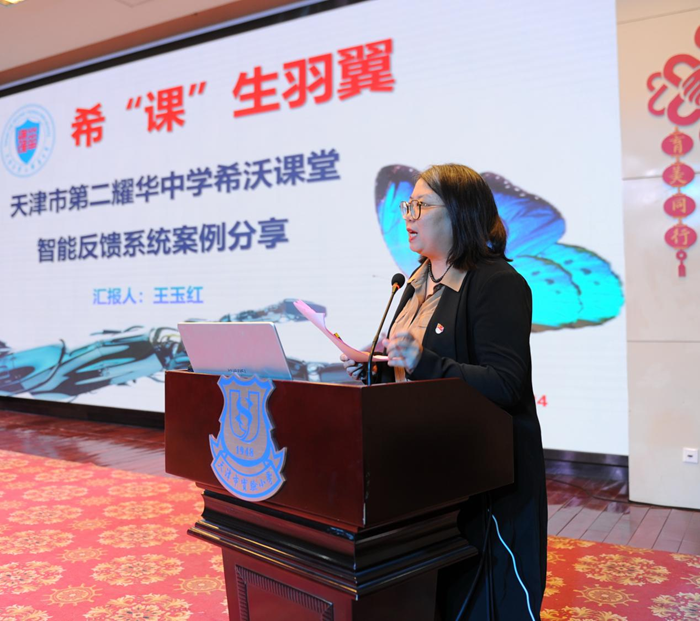 此外,第二耀華中學的王玉紅主任和漢陽道中學的高媛媛老師,分別圍繞《天津市第二耀華中學希沃課堂智能反饋系統案例分享》、《課堂智能分析數據的應用—以物理組為例》,全面展示了希沃課堂智能反饋系統的魅力——包括其如何幫助教師實現從經驗教學向循證教學的轉變、如何實現校本教研的高效融合。