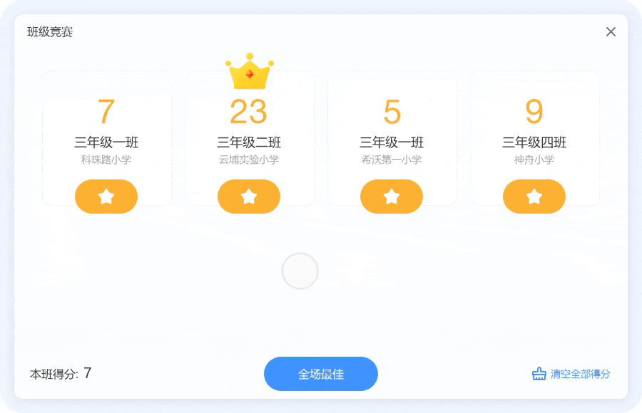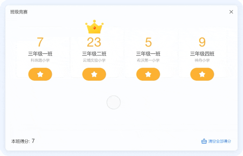 為了充分調動學生的積極性,活躍課堂氛圍,提高課堂教學質量,希沃遠程互動助手新增班級點評功能,支持授課端老師在互動中及時地對聽課班級進行點評,并記錄各個班級的得分,同時支持對各班級展示老師的點評過程、各班得分情況以及當前課堂中得分最高的班級。