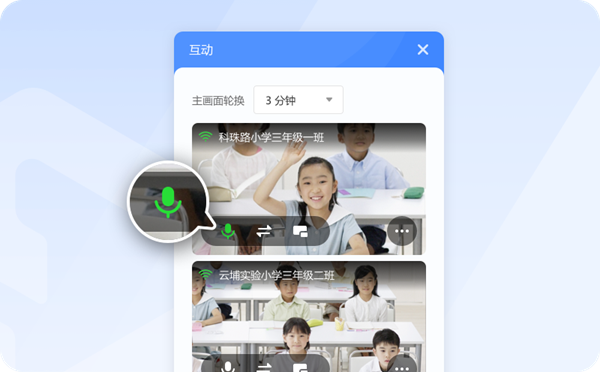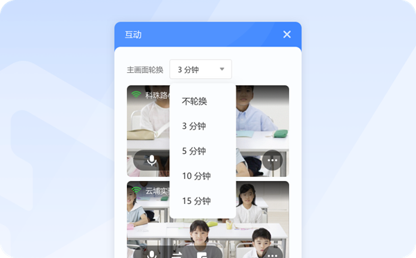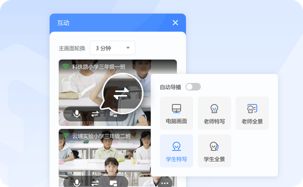 通過遠程互動助手,老師可以選擇開啟主畫面自動輪換,高效巡堂;也可以選擇手動切換主畫面,重點觀察某一班級學生狀態。
