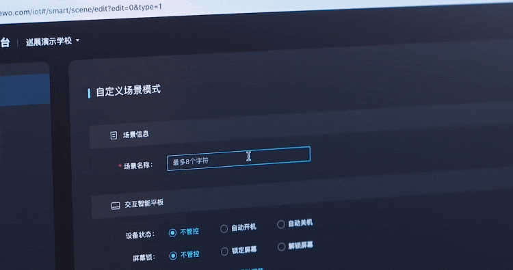 平臺支持自定義場景模式,可根據老師的不同需求,實現不同的個性化場景管控,充分滿足學校自主管理的需求。例如老師可以自定義上課模式,一鍵開啟教室燈光、空調、教學設備等。也可設置自定義放學模式,下課后一鍵關閉所有設備。