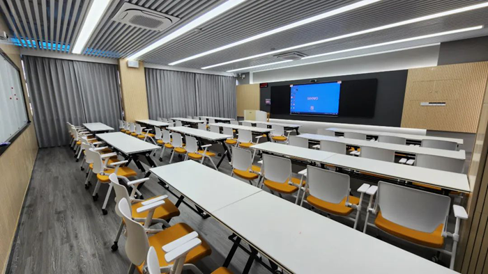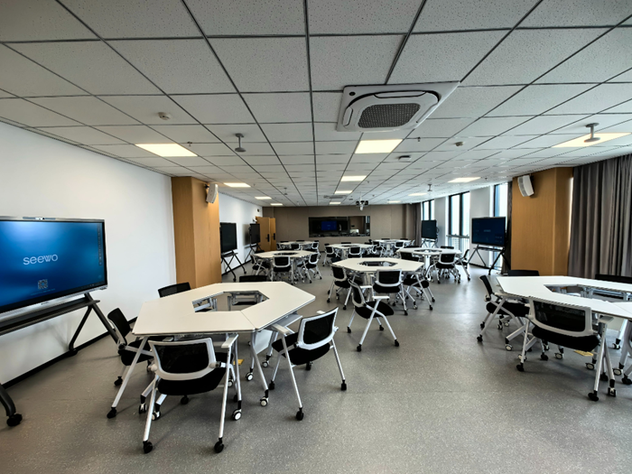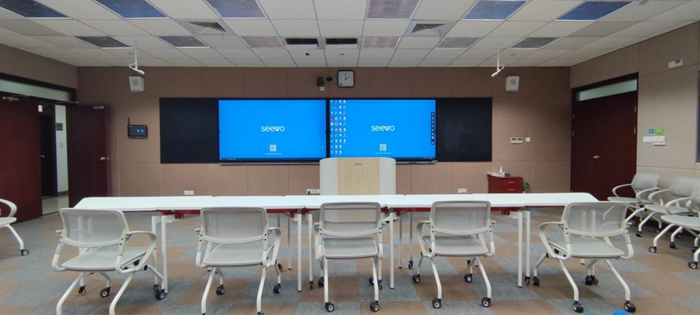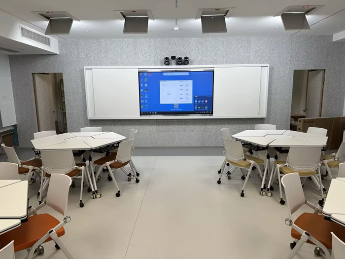 該項目需要在校內建設一個結合精品課程錄制+AI賦能培訓分析的多功能媒體教室,希沃錄播交付服務團隊為校方提供了整體的項目解決方案介紹與工程裝修設計,為教室配備了先進的錄播設備和智能教育交互平板,AI算力賦能系統,支持課程錄制、在線教學和數據分析等功能。最終呈現效果充分滿足以實現技術中心小組日常進行學術研討、人員專業技能培訓等各種教學與研討需求。