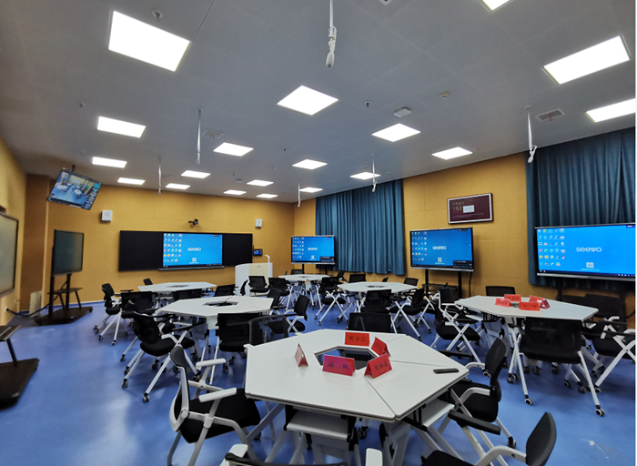 滿足學校常態化混合教學模式應用需求,希沃錄播為復旦大學教師教學發展中心改造多功能智慧教室,通過教室環境勘測、教室裝修設計、軟硬件設備部署、基礎運用操作培訓等全流程服務,保障學校錄播教室的實際應用效果。
