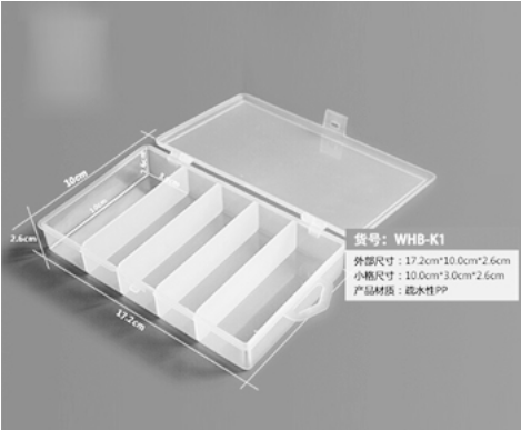 產(chǎn)品編號 格數(shù) 顏色 蓋子 小格尺寸 規(guī)格 WHB-K1 五格 透明 連蓋 長10cm寬3cm高2.6cm 1個/包,10個/盒 WHB-K2 單格 透明 連蓋 長8.4cm寬5.8cm高3.3cm 2個/包,20個/盒 WHB-K3 單格 透明 分蓋 長11.7cm寬6.5cm高3.4cm 2個/包,20個/盒 WHB-K4 四格 黑色 分蓋 長9.05cm寬3cm高36cm 1個/包,10個/盒