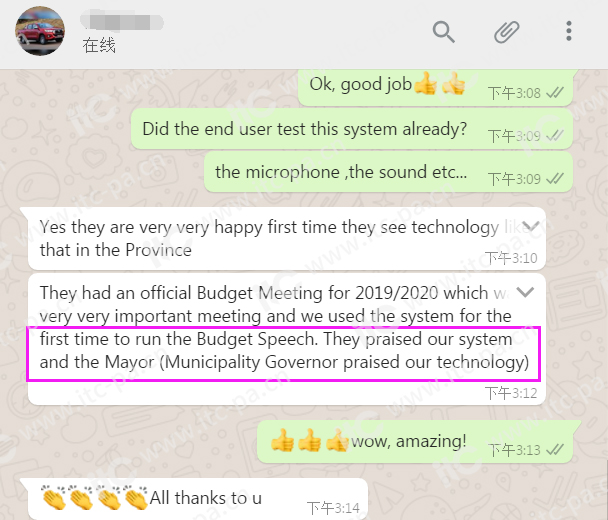 itc高質(zhì)量的產(chǎn)品及優(yōu)秀的服務(wù)得到了客戶及該市市長(zhǎng)高度贊揚(yáng),為政府開啟大型會(huì)議奠定了堅(jiān)實(shí)的設(shè)備基礎(chǔ),感謝客戶對(duì)itc的選擇與支持,我們將再接再厲,以更好的產(chǎn)品和服務(wù)反饋給客戶。