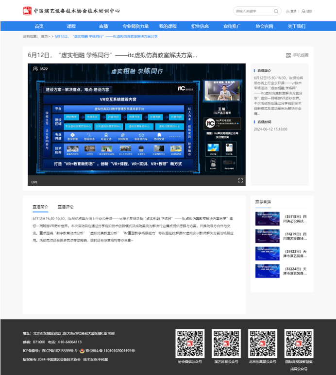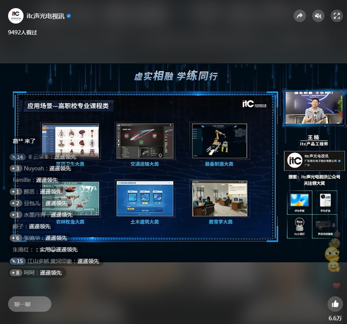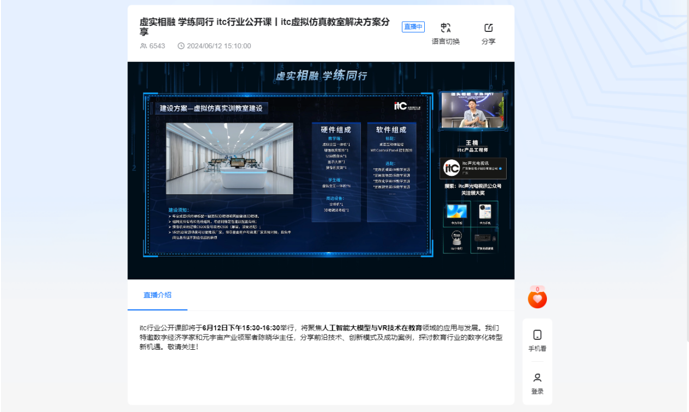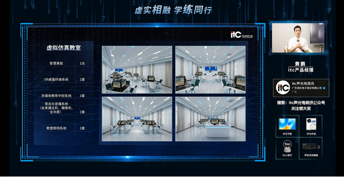 6月12日下午,一場主題為“虛實相融 學(xué)練同行”的行業(yè)公開課在【itc聲光電視訊】直播間成功舉辦!這場公開課聚焦itc虛擬仿真教室解決方案,旨在引領(lǐng)觀眾深入探討其在教育領(lǐng)域的創(chuàng)新應(yīng)用與未來發(fā)展。此次活動得到多個協(xié)會的支持,慧聰教育、演藝設(shè)備協(xié)會及數(shù)字音視工程網(wǎng)等協(xié)會平臺進行同步直播。