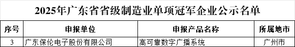 近日,2025年廣東省省級制造業單項冠軍企業名單已在廣東省工業和信息化廳網站完成公示,itc保倫股份憑借核心創新產品“高可靠數字廣播系統”成功入選“2025年廣東省省級制造業單項冠軍企業”!