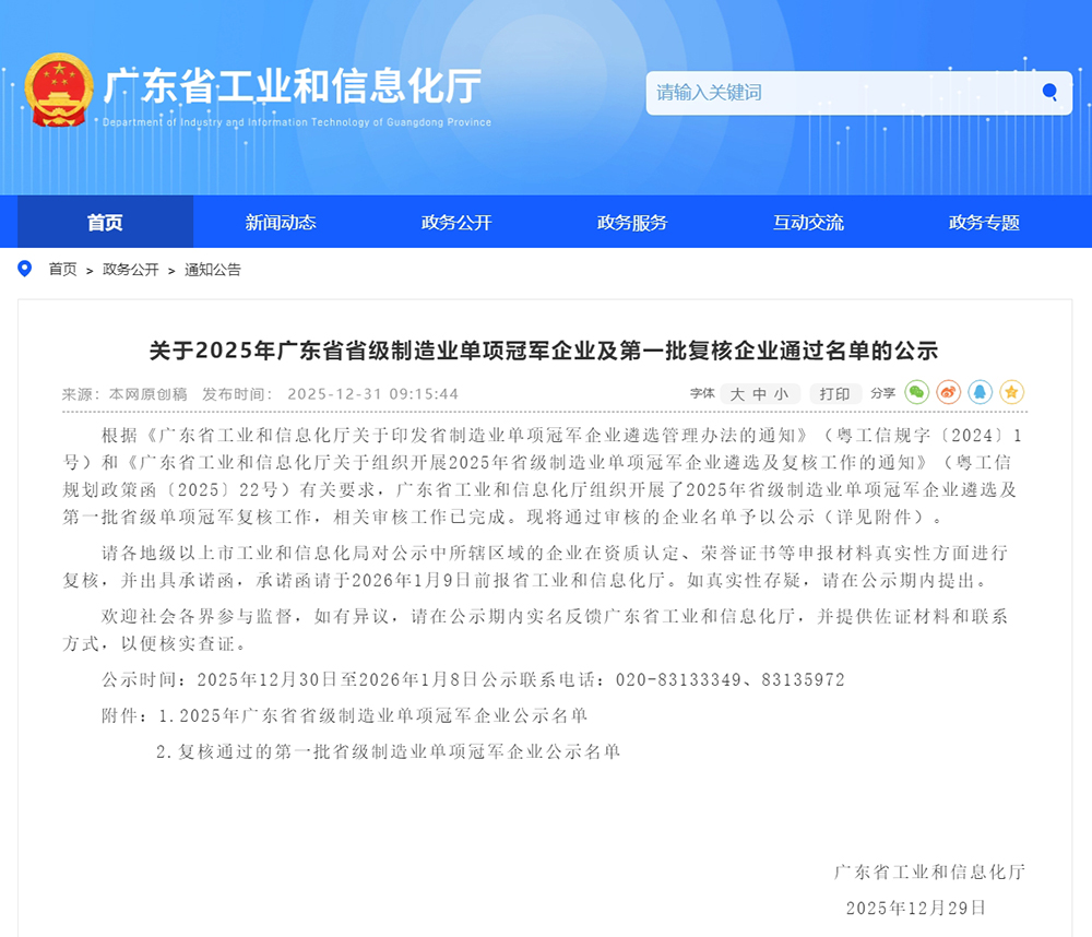 2025年廣東省省級制造業單項冠軍企業