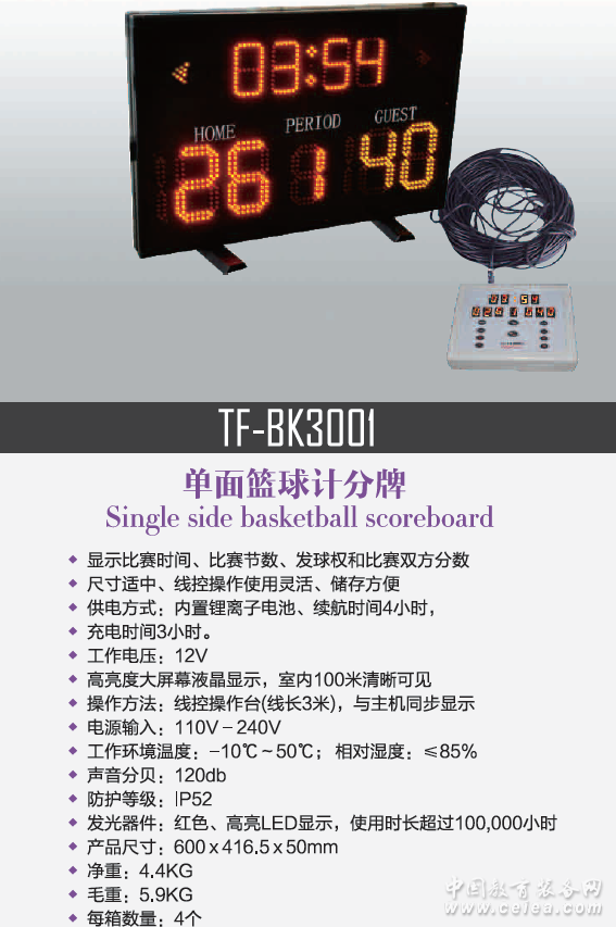 產(chǎn)品名稱:籃球計(jì)分牌 產(chǎn)品型號(hào):TF-BK3001 一、功能概述: ●顯示比賽時(shí)間(00-99分鐘可調(diào)),比賽時(shí)間以(分:秒)顯示,當(dāng)剩余時(shí)間小于1分鐘時(shí)變?yōu)榘俜置腼@示 ●顯示比賽節(jié)數(shù)(顯示范圍0-4) ●顯示主/客隊(duì)分?jǐn)?shù)(顯示范圍0-199) ●顯示發(fā)球權(quán)。