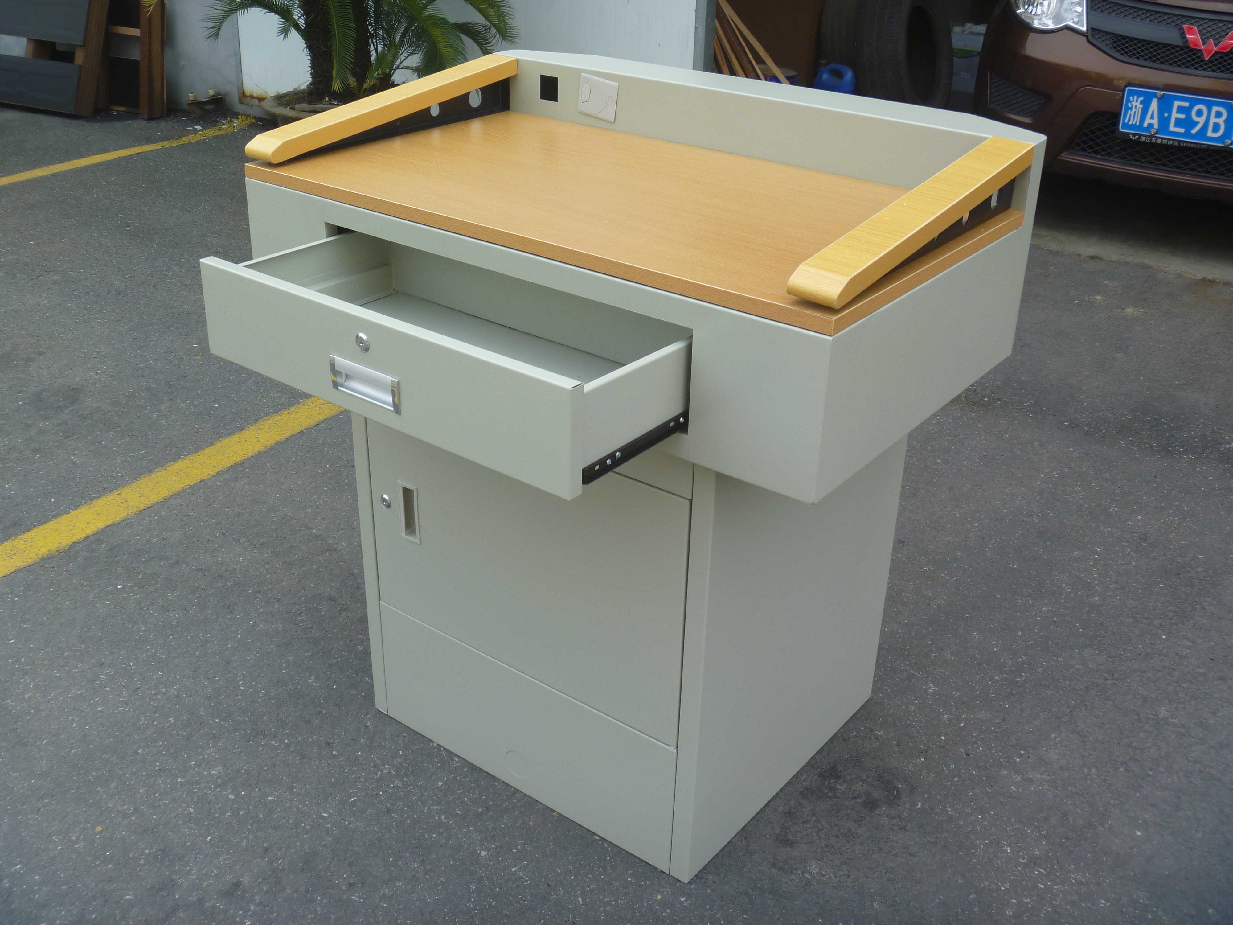 產(chǎn)品詳細(xì)介紹講臺尺寸:長900 mm ×寬600 mm ×高950 mm。 1,講臺采用上下分體式結(jié)構(gòu)設(shè)計(jì),上體為鋼木結(jié)構(gòu)組合。二側(cè)扶手采用木制扶手,桌面采用耐刮木面板設(shè)計(jì),可以很好的防止靜電、漏電,冬季老師手扶上去不冷,使用起來更人性化。桌面左、前、右三邊緣凸起,防止教具滾落。采用脫脂、除酸、磷化、靜電噴塑等工藝,防腐耐候性強(qiáng),美觀耐用。邊緣及拐角采用圓弧設(shè)計(jì),避免尖角,確保師生安全。采用0.8mm-1.5mm優(yōu)質(zhì)冷軋鋼板。 2、講臺帶防盜、防水、防火、防塵、散熱等功能設(shè)計(jì)。 前門采用左右開門式設(shè)計(jì),方便設(shè)備的操作及維護(hù),前門下邊沿距離地面高度不低200mm。 3、一把鑰匙開啟講臺所有鎖,方便設(shè)備操和和維護(hù); 4、講臺前面設(shè)有儲物抽屜,講臺后上檔配有二三眼電源插座、走線盒等。 5、桌面邊、角采用平滑圓弧過渡、尖角處為圓球角,確保學(xué)生安全;表面采用整體酸洗磷化及靜電噴塑處理,塑粉吸附力強(qiáng),表面光潔。 6、下柜體周圍設(shè)有電源線、信號線等進(jìn)出口位置,方便各線纜的進(jìn)出,內(nèi)部設(shè)有理線架,使線纜布置井然不紊;并配有防靜電接地柱,有效防止靜電。 |