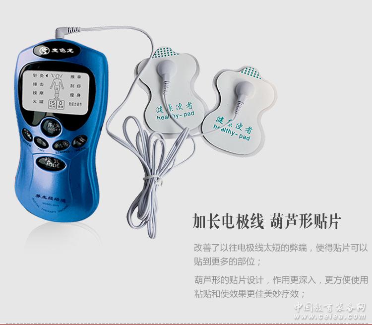 特點⑴ 應用數碼技術,將人體所需的物理因子轉變為精確的數碼信號,再由計算機根據人體需要進行綜合治療,保證了治療的精確性,大大提高了治療的功效。 ⑵ 超大LCD液晶顯示,包含強度、功能、模式、治療、時間、中英文顯示系統,人體經絡穴位圖等,八大功能自行設定,極易操作。 ⑶ 使用紅外線電極貼片,覆蓋面積更大。 ⑷ 獨特的"免疫調節"功能,增強和協調身體抵抗力,幫助人體戰勝外來的細菌、病毒等病原體的能力。 ⑸ 奇妙的波形組合,讓您切實體會到針灸、捶擊、按摩、火罐、推拿、刮痧的真實感覺。 ⑹LCD經絡圖指導治療。根據癥狀選擇不同的穴位進行治療,如果您只是需要按摩以解決疲勞,那么可以根據穴位圖選擇穴位或者在疼痛的地方進行即可,非常方便。