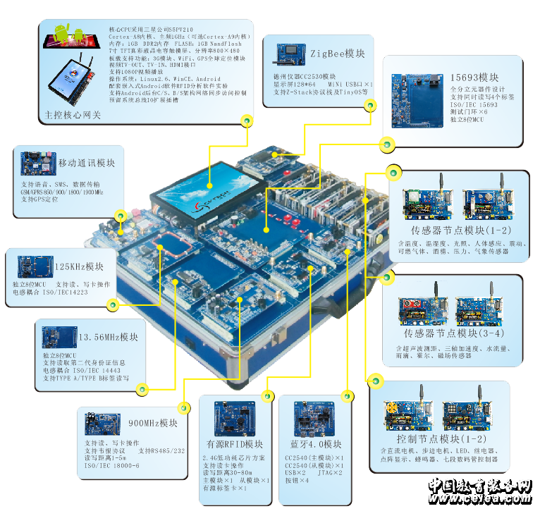 4.通信模塊涵蓋了GPRS通信、GPS定位、有源標簽、藍牙4.0等模塊,主從模塊搭配設計,實驗開發非常靈活。