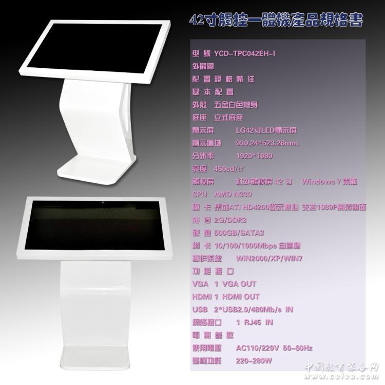 產品詳細介紹 基 本 配 置 | | 外殼 | 五金白色機身 | | 底座 | 立式底座 | | 顯示屏 | LG42寸LED顯示屏 | | 顯示區域 | 930.24*523.26mm | | 分辨率 | 1920*1080 | | 亮度 | 450cd/㎡ | | 觸摸屏 | 紅外觸摸屏 42 寸 | Windows 7 兩點 | CPU | AMD N330 | | 顯 卡 | 集成ATI HD4200顯示核心 | 支持1080P高清畫面 | 內 存 | 2G/DDR3 | | 硬 盤 | 500GB/SATA3 | | 網 卡 | 10/100/1000Mbps 自適應 | | 操作系統 | WIN2000/XP/WIN7 | | 功 能 接 口 | | VGA | 1 VGA OUT | | HDMI | 1 HDMI OUT | | USB | 2*USB2.0/480Mb/s IN | | 網絡接口 | 1 RJ45 IN | | 電 氣 參 數 | | 使用電壓 | AC110/220V 50-60Hz | | 整機功耗 | 220-280W | |