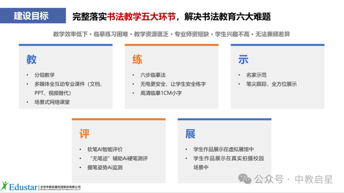 該智慧書法教室整體解決方案是基于學(xué)校用戶目前在書法教育領(lǐng)域廣泛存在的六大難題教學(xué)效率低下、臨摹練習(xí)困難、教學(xué)資源匱乏、專業(yè)師資短缺、學(xué)生興趣不高、無法兼顧學(xué)生個體差異等,提供系列產(chǎn)品、軟件和課程資源來完整落實(shí)書法教學(xué)教學(xué)、練習(xí)、示范、評價、展示五大環(huán)節(jié),有效解決書法教育六大難題。