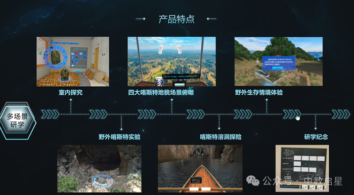 學生此次體驗的地理VR研學喀斯特地貌專題課程,設計了一個完整的野外研學流程,從出發前的準備、地上喀斯特游覽、尋找喀斯特溶洞到地下溶洞探險,都進行了精心的設計和制作。