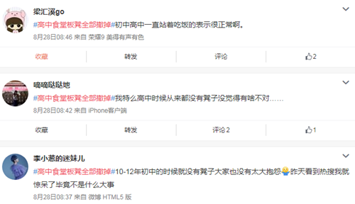 “站著吃飯”并非個例。全國有很多學校或是由于經費有限導致基礎后勤設施不到位、或是出于“提高學生用餐效率”的初衷主動撤掉了凳子,從網友的留言中可見一斑: