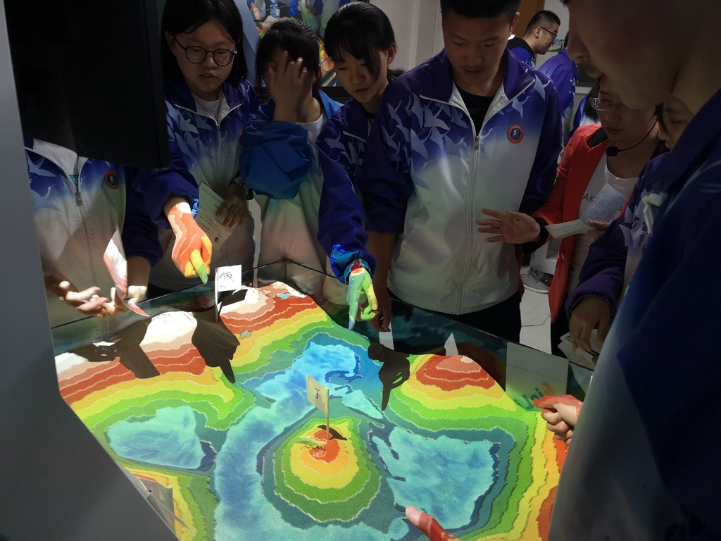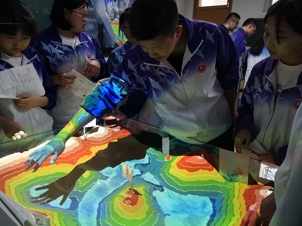 地理AR沙盤結(jié)合了計(jì)算機(jī)、投影機(jī)、體感追蹤設(shè)備,當(dāng)學(xué)生在沙盤中堆砌沙子呈任意形態(tài)時(shí),體感追蹤器會(huì)實(shí)時(shí)測(cè)量出下方沙子的高度,投影機(jī)會(huì)依據(jù)模型高度投射分層設(shè)色圖,進(jìn)而演示不同地形地貌。隨著學(xué)生移動(dòng)沙盤內(nèi)的沙子,追蹤器捕捉其形態(tài)變化,投射的色彩和等高線也會(huì)發(fā)生相應(yīng)的變化。
