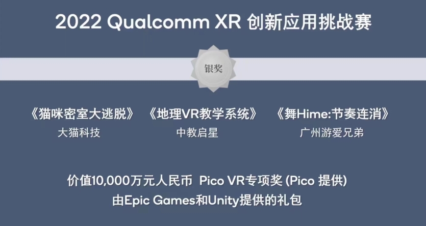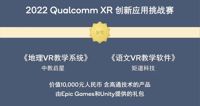 “2022 Qualcomm XR 創(chuàng)新應用挑戰(zhàn)賽”整個賽程共設立10組賽道,41個獲獎名額。自3月17日正式啟動報名以來,先后收到了超過450來自海內(nèi)外XR領(lǐng)域的參賽作品,大賽評審從最終提交的230多個符合大賽要求的作品中,評選出70多個優(yōu)秀參賽作品入圍決賽環(huán)節(jié),最終有39個優(yōu)秀參賽作品分別獲得本屆大賽白金獎、金獎和銀獎。北京中教啟星科技股份有限公司的地理研學VR教學系統(tǒng)榮獲VR行業(yè)組產(chǎn)品金獎,并在PICO VR專業(yè)組中斬獲銀獎。