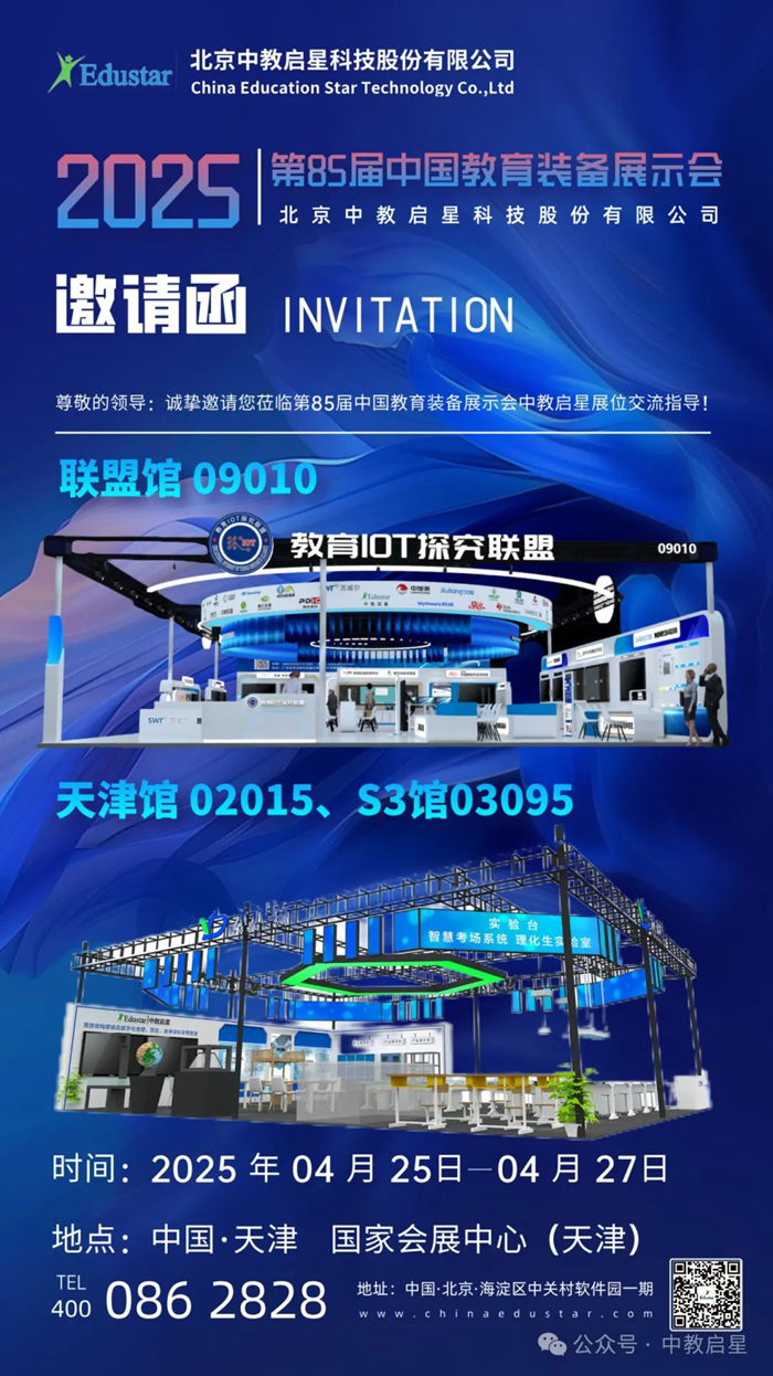 春光明媚,由中國教育裝備行業協會主辦的第85屆中國教育裝備展示會將于2025年4月25日-27日在國家會展中心(天津)盛大開幕。中教啟星攜手EIOT聯盟、天津永利達實驗設備有限公司亮相S3館03095、天津館02015、聯盟館09010.誠摯邀請教育界各位同仁來到津城天津,探索體驗以數字化和虛擬現實技術革新的地理、歷史、數學、學科+VR、新勞動教育領域的創新與發展,一同見證教育裝備的成長與未來!