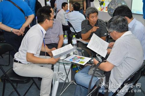 (參觀者在中教啟星展位探討“數(shù)學(xué)探究實(shí)驗(yàn)室方案”)