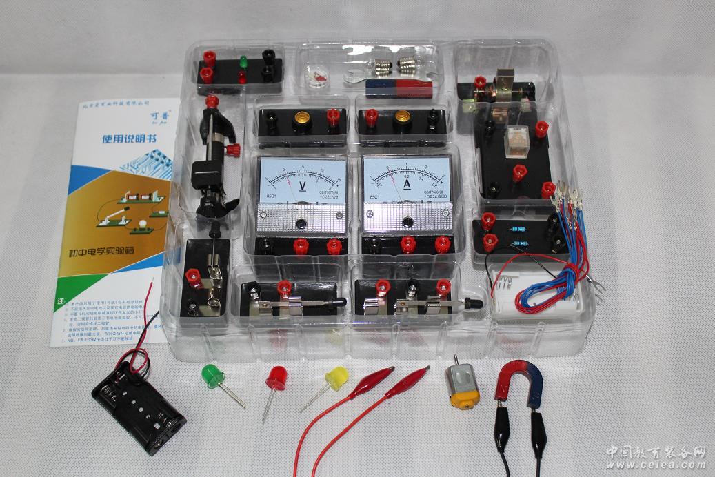 (8)小型靈敏電動機1個,上面的電刷和換向器可拆下來,上面的永久磁鐵也可以取小來做磁學實驗,而且非常靈敏, 調節好只需1.5V(一節新電池)的電壓就能轉起來。這也是本器材特有的。這種電動機能清楚看清電動機的結構,對照課本介紹的電動機的各種結構一看就一目了然,對學生學習電動機原理這節課非常重要,能使學生認識什么是電動機的平衡位置,知道什么是換向器、什么是電刷等結構,不像有些低價學具用的是剃須刀上的電動機。