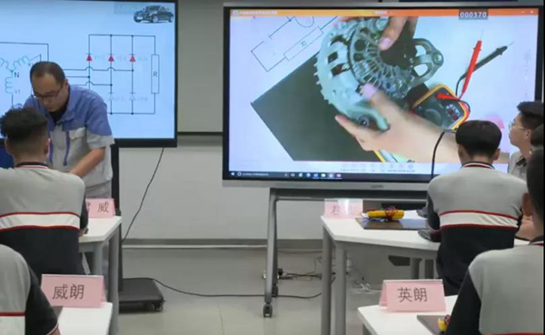 在強交互實訓(xùn)課堂中,跨區(qū)域教學(xué)是重點。在展會上,工作人員會演示相隔距離的異地教學(xué),展示不同時間空間的同步課堂。