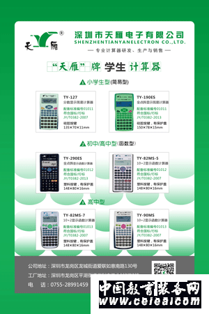 | 深圳市天雁電子有限公司是一家集設(shè)計(jì)、開發(fā)、生產(chǎn)、銷售和服務(wù)于一體的教育電子產(chǎn)品專業(yè)生產(chǎn)企業(yè)。公司主要產(chǎn)品有:“天雁“牌系列中小學(xué)數(shù)學(xué)教材配套用計(jì)算器;“天雁“牌學(xué)生計(jì)算器科學(xué)函數(shù)計(jì)算器圖形計(jì)算器辦公臺(tái)式計(jì)算器手寫板計(jì)算器 |