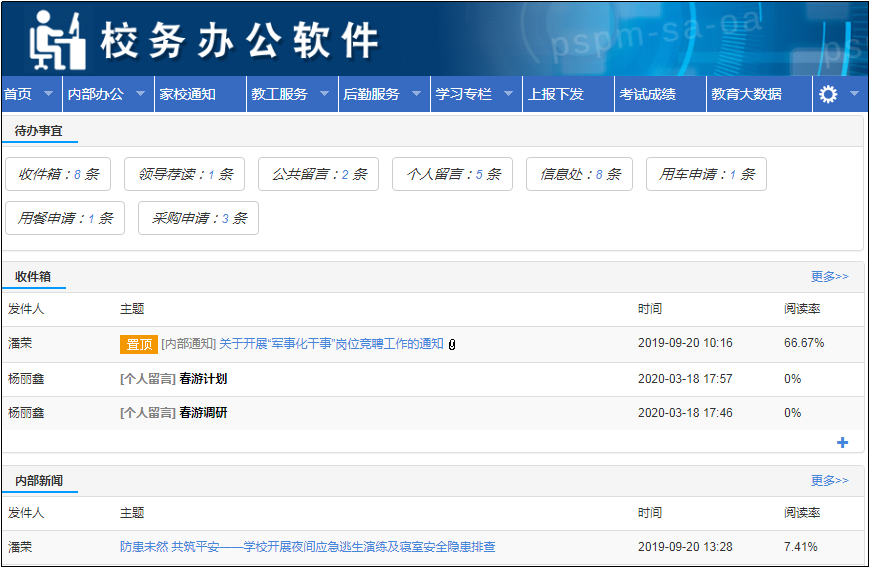 高效辦學,從高效管理開始;高效管理,從高效辦公開始。釋銳校務辦公系統(tǒng)不僅僅是一個通知系統(tǒng),而是一個適用于學校和教育局的無紙化辦公套件,集成整合了“站內信、工資查詢、班級常規(guī)(德育)、打卡簽到、日程、網(wǎng)絡U盤、報修、請假、打印、會議、區(qū)校上報下發(fā)通知”等11+個常態(tài)化遠程辦公模塊,是一個廣義范圍上的無紙化遠程辦公系統(tǒng)。