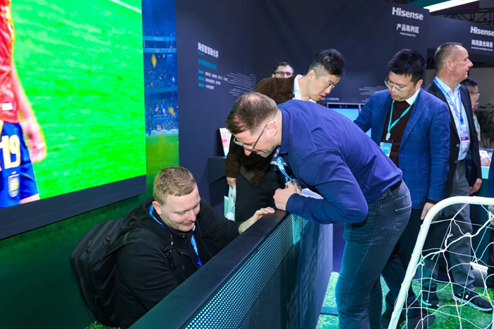 體育場場景則是還原了線下體育觀賽,通過“LED氛圍屏+SP系列圍欄屏”組合的方式,打造身臨其境的觀賽體驗。作為世界杯、歐洲杯等多屆世界大型體育賽事的贊助商,海信LED產品在全球多個大型專業足球場落地,為球迷打造更加沉浸式的觀賽體驗。另外,觀眾們還可近距離體驗海信多款小間距LED顯示屏,感受海信LED豐富的產品矩陣。