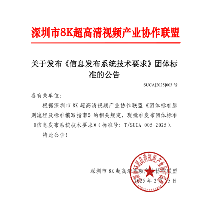 近日,由海信商用顯示公司牽頭制定的《信息發(fā)布系統(tǒng)技術要求》團體標準正式發(fā)布。該標準由深圳市8K超高清視頻產業(yè)協(xié)作聯盟發(fā)布,旨在提升信息發(fā)布系統(tǒng)領域的規(guī)范性和統(tǒng)一性,以助推行業(yè)健康發(fā)展。