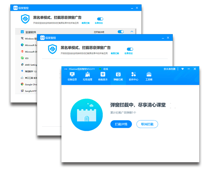 易管控,借助海信信發(fā)智控平臺,可實現全品類設備統(tǒng)一管理,進行實時、定時控制,遠程升級和卸載軟件,管理高效輕松,搭配移動端APP,可隨時隨地掌控設備。