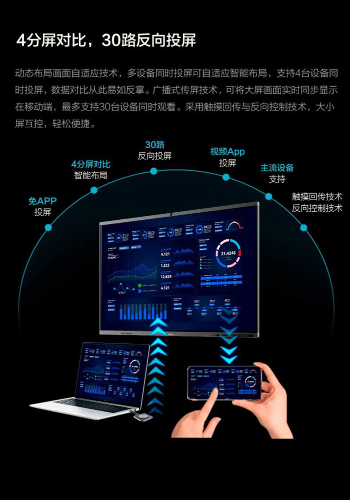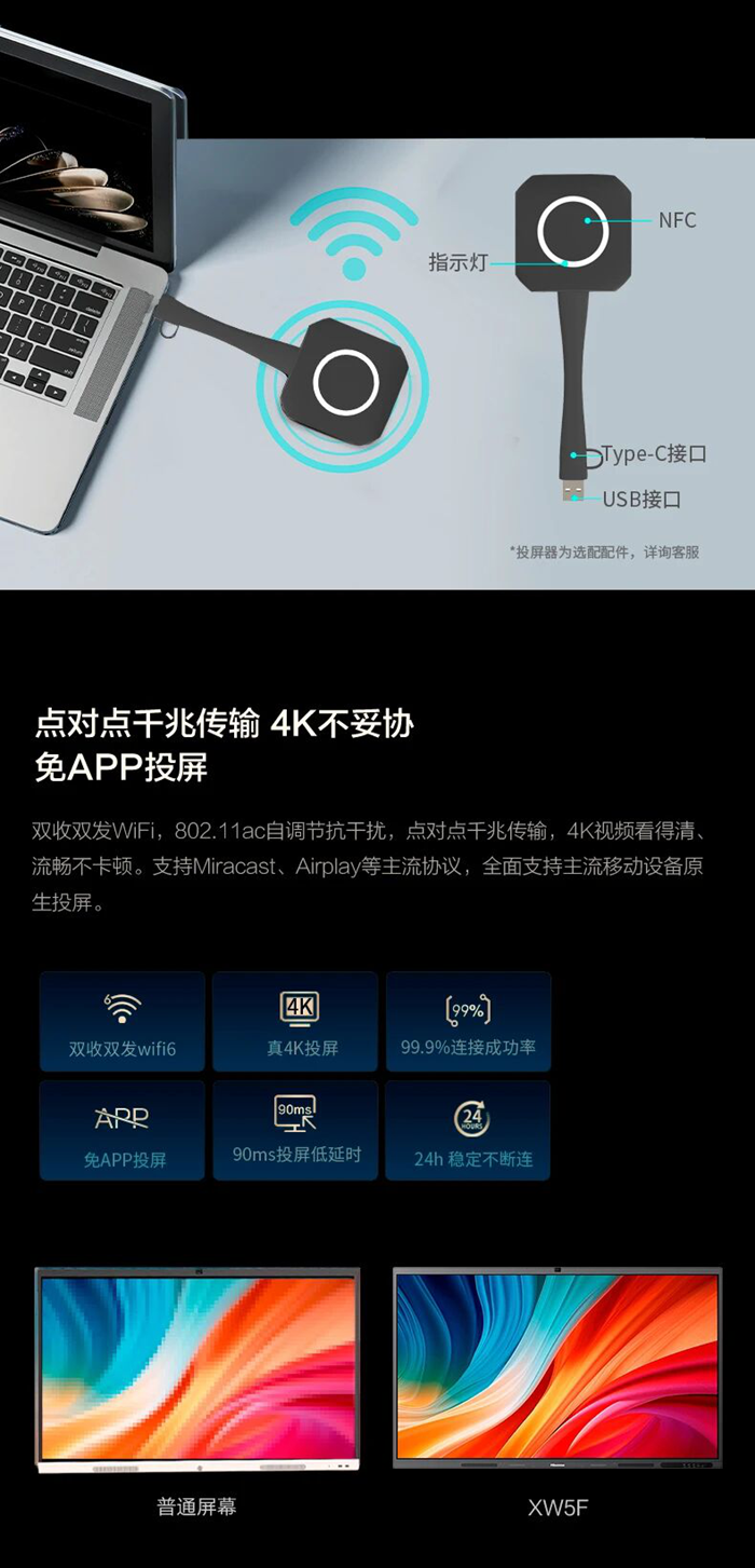 支持Type-C免驅(qū)投屏及Miracast、Airplay等主流協(xié)議,無(wú)論是筆記本電腦、手機(jī)還是平板,均可實(shí)現(xiàn)“一鍵秒投”,毫秒之間快速將內(nèi)容同步至大屏,讓討論焦點(diǎn)回歸內(nèi)容本身。