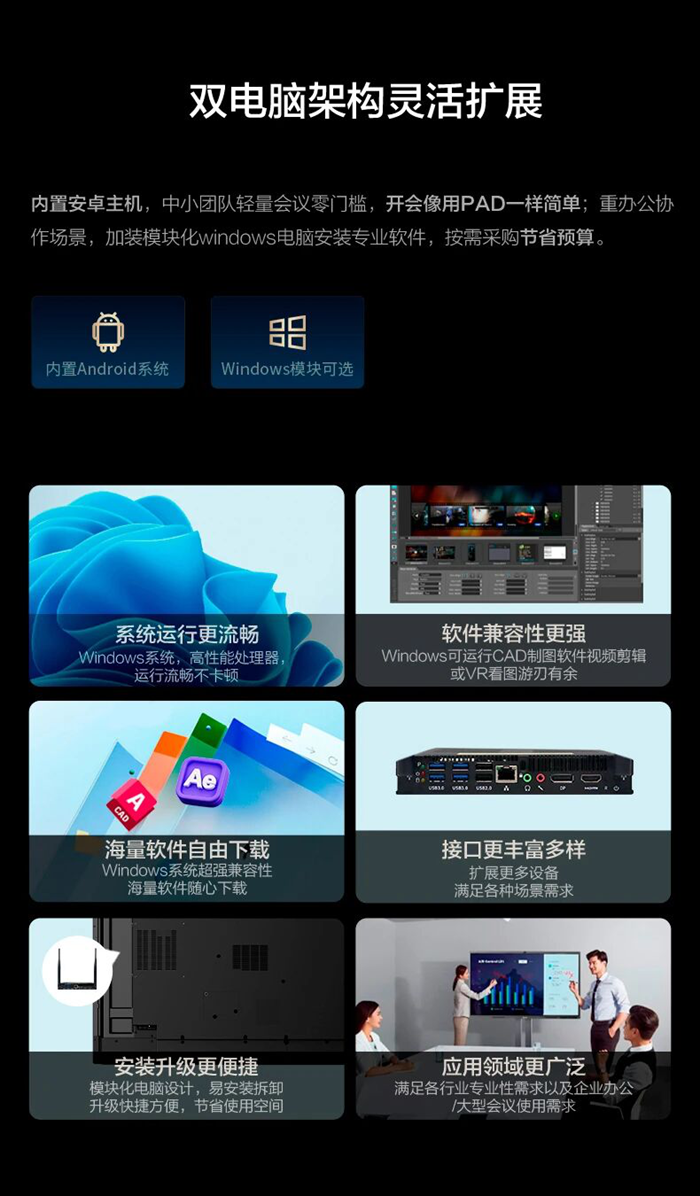 兼容雙系統(tǒng),如需更強(qiáng)算力或使用Windows軟件,可以加裝Windows電腦模塊,易安裝拆卸,升級(jí)快捷方便。