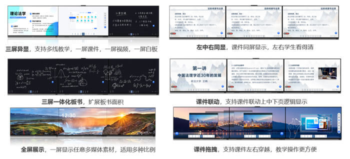 本次展會,海信帶來窄邊多拼新品,打破傳統顯示邊界,支持雙屏、三聯屏隨心拼接,憑借絲滑流暢的聯動體驗,為課堂注入全新活力。產品支持多屏一體化板書、課件與板書上下頁聯動、全屏獨占一體化播放素材、多屏異顯課件板書對比教學等多種授課模式,精準適配不同學科老師的教學需求和授課習慣。同時支持授課窗口可視化多屏互動流轉,簡單易上手,參展用戶可現場上手體驗,直觀感受這款新品帶來的教學便捷與高效。