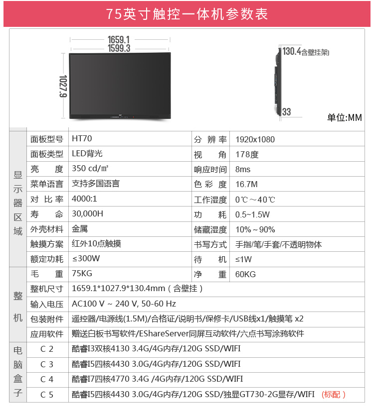 中銀(BOCT)75英寸4K高清智能觸控一體機