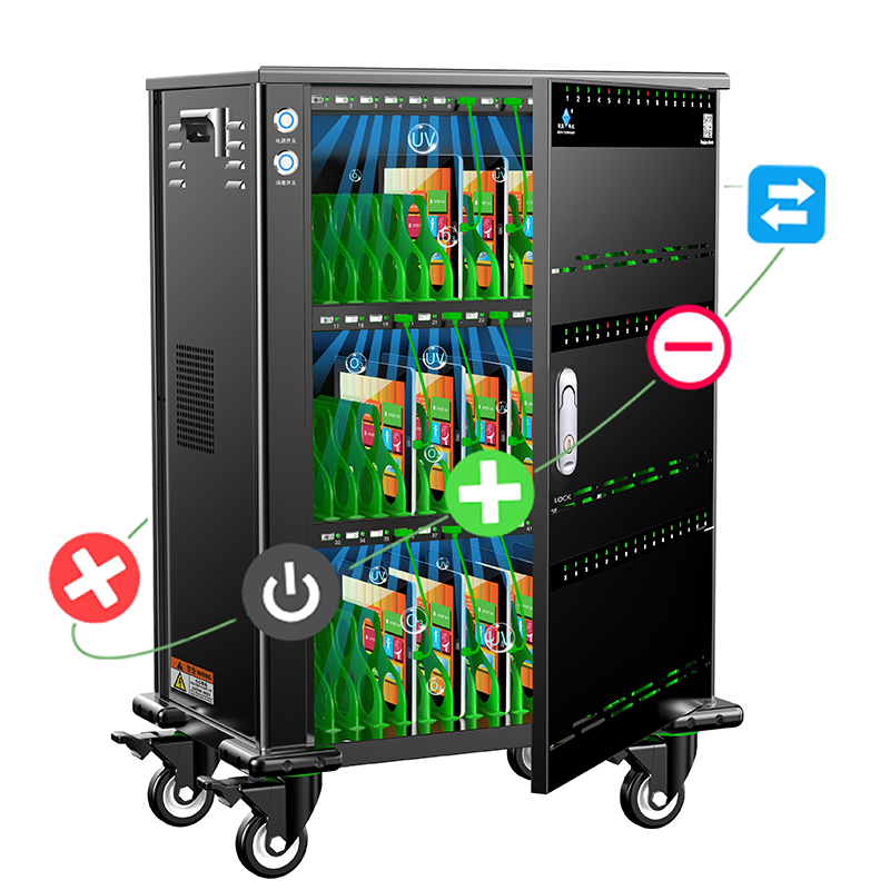 產(chǎn)品詳細介紹品牌:際慶科技 型號:SYNC48 Sync 48 招投(應標)參數(shù): 功能參數(shù): 1、48口直流充電USB 5V2.4A且每口穩(wěn)定兼容HUB數(shù)據(jù)傳輸功能并對應配48條綠色數(shù)據(jù)線(充電IC芯片智能識別平板、手機等設備所需要的電流,安全、穩(wěn)定、高效); 2、★每口獨立充電并具備智能LED轉(zhuǎn)燈功能(紅燈:充電狀態(tài) 中,綠燈:充滿/未連接),且有對應的數(shù)字序號; 3、★金屬按鈕開關,可過15A以上大電流,兼具電源開關和通電指示功能,單120mm風扇,搭配智能溫控系統(tǒng),30℃±8自動啟停; 4、★主動式PEC節(jié)能開關電源,柜內(nèi)置十重安全保護①雷擊保護②浪涌保護③過載保護④漏電保護⑤隔離保護⑥過流保護⑦過壓保護⑧短路保護⑨過充保護⑩灌流保護; 5、★自動消毒功能,紫外線+臭氧O₃雙重消毒,搭配金屬按鈕開關,啟動25min后自動關閉(選配項); 6、★定時充電具有電子顯示屏/多組設置/精準定時/倒計時設置(根據(jù)使用習慣隨意設定啟停時間段)(選配項); 7、★支持數(shù)據(jù)同步功能,能批量一鍵安裝和卸載APP,支持文件分發(fā)、文件刪除、一鍵關機等智能化管控,監(jiān)測設備實時充電狀態(tài)和電量等(選配項)。 結構參數(shù): 1、★外形尺寸≤582*830*358mm(含腳輪、防撞角),工位容積為320*200*25mm ,頂邊圓弧(≥R8)設計; 2、★兩側設有ABS工程提手,柜體四個底角加裝凸高15mm軟塑防撞角,配裝 4個3寸帶剎車天然橡膠靜音腳輪(高度105mm); 3、★三層式全黑16(每層)工位設計,配裝ABS綠色隔斷,單開前門鎖,左側艙為電源管控封閉區(qū); 4、★門板透明視窗部分與內(nèi)部充電LED燈一一對應,且有相應的數(shù)字序號,前門板與側板設有對流孔,通風散熱。 產(chǎn)品資質(zhì): ①★整機CCC認證(原廠蓋章證明) ②★具有商標(國際分類20和9)證書(原廠蓋章證明) ③★具有軟件著作權(原廠蓋章證明) ④★具有ISO9001:2015質(zhì)量管理體系認證(原廠蓋章證明) ⑤★具有產(chǎn)品專利證書(原廠蓋章證明) ⑥★具有AAA企業(yè)信用等級證書(原廠蓋章證明)