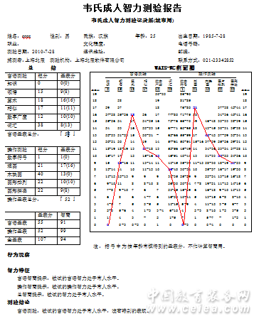 產(chǎn)品詳細(xì)介紹一、產(chǎn)品優(yōu)勢: 1、系統(tǒng)設(shè)置:超級(jí)管理員可以管理其他管理員。所有管理員可以設(shè)置機(jī)構(gòu)的信息、添加、修改測試者的信息,可以開始為測試者設(shè)置測試。 2、測驗(yàn)順序限制:遵循先易后難的原則,軟件中做相應(yīng)的限制,前面的分測驗(yàn)沒有做完就無法做后面的測驗(yàn)。 3、測試完整呈現(xiàn):在測驗(yàn)窗口中,呈現(xiàn)了測驗(yàn)項(xiàng)目、評分參考,還能對測試者的回答進(jìn)行記錄,現(xiàn)場評分等完整的內(nèi)容。在同一個(gè)窗口,可以隨時(shí)在測驗(yàn)界面和規(guī)則界面進(jìn)行切換。 4、可停止測驗(yàn):當(dāng)在做完某個(gè)分測驗(yàn)時(shí)停止,下次同一測試者登陸的時(shí)候可以接著進(jìn)行下一個(gè)分測驗(yàn)。 5、自動(dòng)免做:分測驗(yàn)有一些題在普通情況下是免做的,在一定的條件下又要求做。這些問題完全由軟件自動(dòng)完成。 6、真人讀題:在允許的情況下,可以用這一功能代替施測者讀題。 7、自動(dòng)計(jì)算:可以根據(jù)評分結(jié)果自動(dòng)計(jì)算IQ分類。計(jì)算時(shí)可以選擇不同的計(jì)算方式,如加權(quán)計(jì)分、二合一、四合一、六合一等等。根據(jù)選擇的不同計(jì)分方式,會(huì)產(chǎn)生各自的測驗(yàn)報(bào)告。 8、自動(dòng)計(jì)時(shí):軟件將計(jì)時(shí)功能放在醒目的位置,給施測者以提醒。 9、項(xiàng)目重評:在測驗(yàn)結(jié)束之后發(fā)現(xiàn)某個(gè)項(xiàng)目的評分不準(zhǔn)確,可以對它進(jìn)行重新評分。 10、傷殘?jiān)u定:軟件在智力達(dá)到傷殘的標(biāo)準(zhǔn)時(shí),會(huì)建議使用傷殘報(bào)告。軟件中還安排了《成人智殘?jiān)u定量表》作為參考 11、數(shù)據(jù)管理:可以設(shè)定條件進(jìn)行查詢,以數(shù)據(jù)統(tǒng)計(jì)中可針對某一時(shí)間段的測驗(yàn)、某一年齡段的測試者、某一IQ值區(qū)間等條件進(jìn)行多數(shù)據(jù)查詢。在數(shù)據(jù)查詢窗口中,可以將數(shù)據(jù)導(dǎo)出到excel表格中。 12、數(shù)據(jù)安全:軟件中可以進(jìn)行數(shù)據(jù)筆備份和數(shù)據(jù)還原。