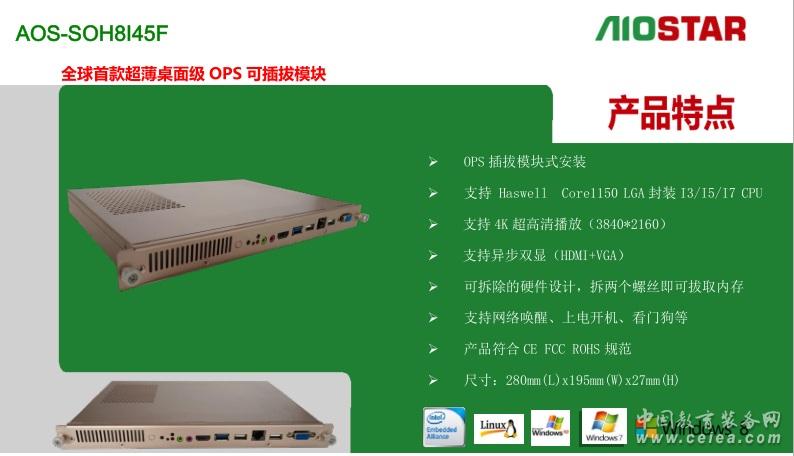 1概述編輯 Aiostar OPS 全稱為:Aiostar Open Pluggable Specification,開放式可插拔規范。是Intel與顯示器廠商共同制定的標準化數字標牌接口規范。OPS內部組成是一個X86架構的迷你PC,采用英特爾酷睿處理器,配有內存、硬盤、多種輸入輸出接口以及Windows操作界面,尺寸為200mm x 119mm x 30mm 。 以下為Intel 官網對于OPS的定義: 原文如下: Digital Signage Open Pluggable Specification :Simplify digital signage development Highlights Enables easier installation, use and maintenance of digital signs. Makes digital signage devices more intelligent and connected. Overview The open pluggable specification (OPS) helps standardize the design and development of digital signage devices and pluggable media players. Intel created OPS to address digital signage market fragmentation and simplify device installation, usage, maintenance and upgrades. OPS enables digital signage manufacturers to deploy interchangeable systems faster and in higher volumes, while lowering costs for development and implementation. Installing digital signage equipment based on Intel architecture helps you implement scalable digital signage applications that can network easily with other equipment. This simplifies interoperability and application upgrades designed to meet the digital signage requirements of individual customers, while helping to future-proof technology investments.[1] 譯文: 強調 更便于安裝、使用和維護的數字信號。 使數字看板設備更智能和融合。 概述 開放的可插拔的規范(OPS)有助于規范的設計和開發數字看板設備,并插入媒體播放器終端。Intel創造OPS 致力于數字看板市場分化和簡化設備安裝、使用、維護和升級。 OPS可以使數字看板制造商更快部署大量的交互系統,同時降低開發和實現的成本。 安裝基于英特爾架構的數字標牌設備可以幫助您實現可伸縮的數字看板應用程序,并且很容易和其他設備進行網絡連接。這簡化了通過交互和升級的設計來滿足個人客戶的數字看板需求,同時有利于面向未來的技術投資。 2特點編輯 1、支持數字標牌等行業最新的OPS規范的電腦模塊,加速數字標牌行業的標準化趨勢。 2、OPS模塊可以簡化設備的安裝、使用、維護和更新,幫助數字標牌制造商降低開發和實施成本。 3、OPS可簡便地與其它設備聯網,可擴展數字標牌應用,滿足數字標牌對交互和應用更新的需求。 4、部分OPS平臺支持遠程管理及低功耗模式,解決耗電及散熱要求。同時平臺所支持的Intel vPro、AMT遠程管理技術,實現設備無人操控下的高效運作。如采用四代i5+Q87平臺的AOS-SOQ8I45A 5、OPS無風扇散熱設計,提供超靜音的解決方案,保證工作環境的安靜、清爽。發熱量小也帶來了較小的功耗。 3整機編輯 Intel 2011年提出該規范后,伴隨著日本NEC OPS接口顯示器的上市,傳統數字標牌嵌入式主板走下神壇,OPS模塊化正式開啟。代表作品有 愛鑫微電子(AIOSTAR) AOS-SOH8I45A ,