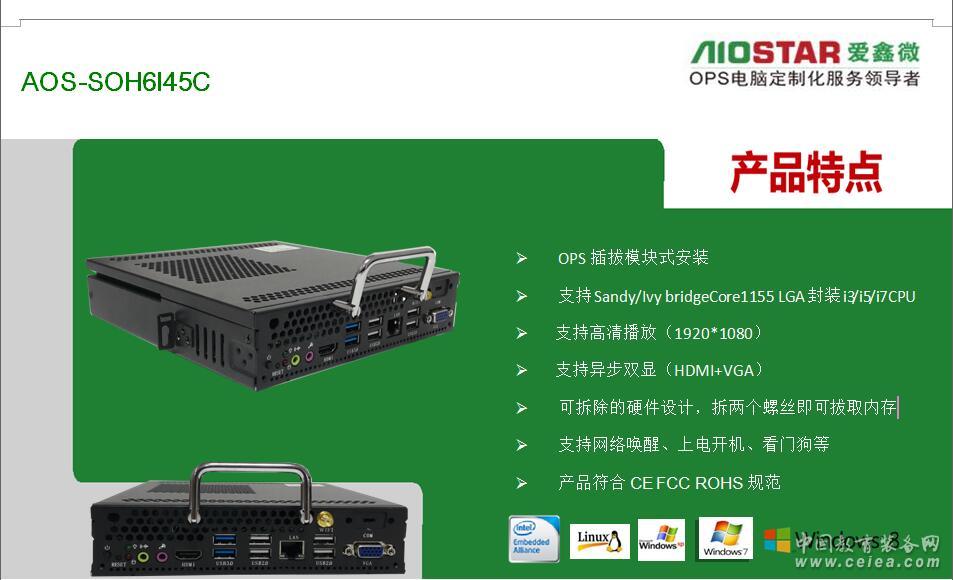 產品詳細介紹深圳市愛鑫微電子有限公司為更好的配合不同廠家的要求,可提供OPS主板與OPS準系統的方案配合各個廣告機,觸控一體機廠家,多媒體壁掛式教學一體機,數字標牌,錄播觸控一體機,同時保證所提供OPS主板與OPS插拔式電腦/OPS-C插拔式電腦主機是完全按照INTEL OPS規范定義的,完全支持鴻合教育一體機、東方中原教育一體機、創維教育一體機、康佳教育一體機、中銀液晶觸控一體機、中電數碼教育一體機、海爾觸控一體、TCL觸控一體機、KTC/HKC/HPC等各大交互式教育觸控一體機廠家,愛鑫微電子提供專業的定制化服務OEM/ODM. 聯系電話:18620397178 QQ:46078934 現階段我司已推出了一系列OPS電腦方案如下: 頂極OPS插拔式電腦方案:H110+6代CPU+2G獨立顯卡(GT730/GT850/GT950) 高端:H110+6代CPU (市場最新方案 4K極清方案)歡迎客戶取樣測試。支持4組USB3.0+3組USB2.0+3組異步顯示(VGA+HDMI+DP)+3組網口(可以直接接IP攝像機進行錄播與監控或者網絡內外網隔離進行封標) 中高端:H81+4代CPU/HM86+4-5代CPU(市場主流) 中端:H61+2-3代CPU/HM65+2-3代CPU(高性價比) 低端:baytrailJ1800/J1900無風扇低成本的OPS電腦(幼教觸控一體機專用) 深圳市愛鑫微電子有限公司(以下簡稱“AIOSTAR”)是一家集研發、生產和銷售于一體的高新技術企業,同時是Intel、AMD、NVIDIA等芯片廠商緊密的合作伙伴。公司主營工業主板(ITX/3.5寸/NANO等)、媒體播放主機、OPS主機、OPS可插拔式電腦模塊、OPS主板、BOX-PC、網絡安全硬件平臺、服務器、工業平板電腦、一體化工作站等產品。目前,產品已廣泛應用于DS、MIDS、IWB、POS、自助查詢、零售金融、工業自動化,智能交通,網絡信息安全,通訊、智能安防,云計算、石油石化、醫療、軍事裝備等多個領域。公司高度重視客戶的需求和滿意度,針對不同的客戶需求,能夠快速做出積極的響應,為其進行量身設計并提供個性化的OEM/ODM服務。 愛鑫微電子本著以“人才是企業的財富,效益是追求的目標,發展是永恒的主題”為宗旨;以“客戶至上,品質為尊“為原則;提倡“博愛”“齊鑫”“微天下”的意愿,愿與全球各地的企業商家攜手合作,共謀發展! 規格參數 處理器 CPU Intel英特爾 Core酷睿 i3-3220 (雙核四線程/3.3GHz/3MB三級緩存/HD2500/22nm/54W/LGA1155) 芯片組 Intel® H61/B75 BIOS AMI 32Mbit,支持無盤啟動、網絡喚醒、上電開機、看門狗等功能 內存 容量 4GB SO-DIMM DDR3 1333 MHz memory , Max.8GB 存儲 SATA接口 MINI PCIE 2.5〞5400rpm 500G 1xMini PCIE 顯示 芯片組 輸出