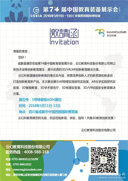 第74屆中國教育裝備展示會將于5月11-13日在四川省成都市中國西部國際博覽城舉辦,云幻科教誠邀教育界領導、朋友蒞臨云幻科教展位,5號特裝館A004展位,共探3D教育發展。