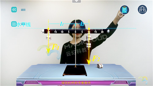 如探究杠桿的平衡條件課程中,常規教學中,力的方向是不可見的,杠桿的平衡與否僅是靠肉眼的觀察,對于實驗的分析記錄或會存在誤差。AR實驗中,學生們可以通過AR添加輔助線、力的方向標識等清楚、正確操作實驗內容,觀察并記錄正確的實驗數據,習得杠桿平衡的條件及公式。